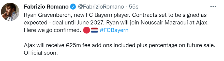 关于阿贾克斯中场格拉文贝尔奇转会拜仁的传闻早已经在媒体和球迷之间广为流传。而日前知名足球记者罗马诺也在自己的社交媒体上确认了这一消息。