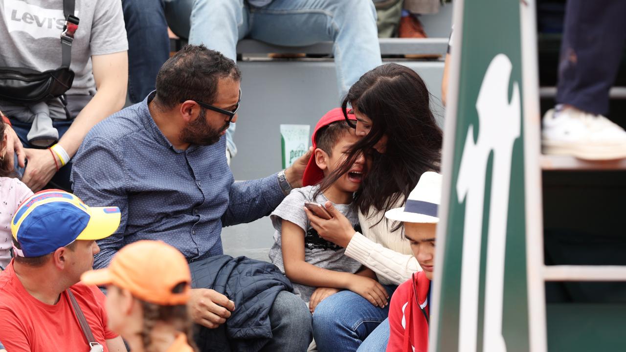 "球拍从长椅上弹到了观众席上。球拍意外地落在了观众区,与一名年轻观众擦肩而过。在最初的惊吓之后,该观众被证实没有问题。大满贯主管与与孩子在一起的父母进行了交谈,父母确认孩子很好,没有受伤。根据程序,对违反体育道德的行为进行了处罚"。