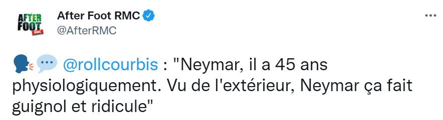 库尔比斯在节目中表示:“内马尔的身体年龄已经45岁了。无论从外在还是内在来看,内马尔都像一个牵线木偶,他的表现荒唐透顶。如果他的表现能够职业一些,不在凌晨四点去打扑克牌的话,或许他的成就能够超过梅西。现在,内马尔比梅西年轻这件事在我这里听着像是在开玩笑一样。”