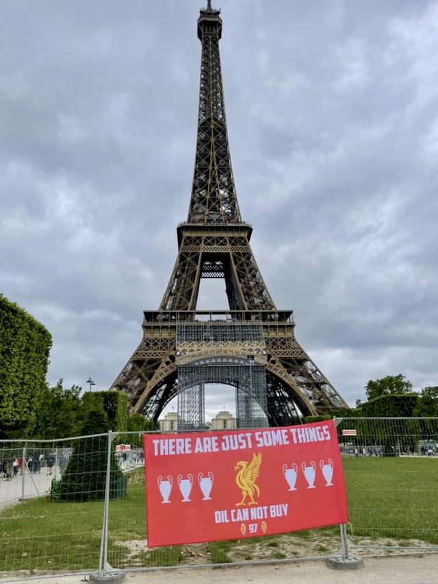 在来到巴黎之后,有部分球迷前往埃菲尔铁塔,悬挂为利物浦助威的旗帜。这面旗帜印有利物浦获得的六座“大耳朵杯”,还写有“有些东西用石油买不到”的字样,颇有嘲讽巴黎圣日尔曼的意味。