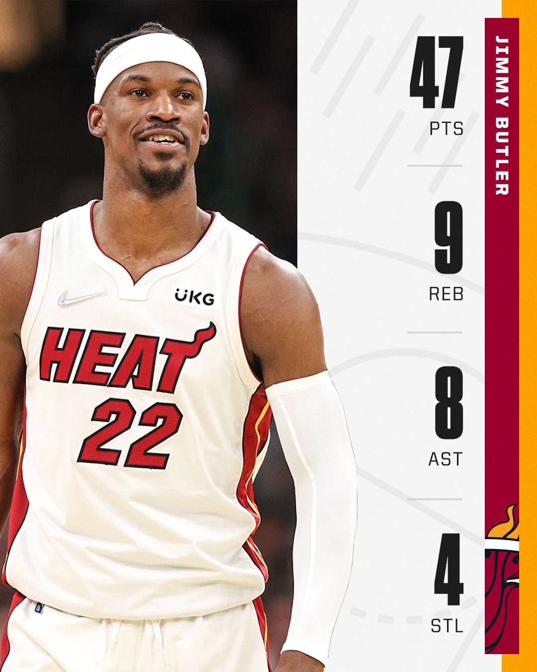 巴特勒今天狂砍47分创热火队史季后赛生死战新高,超越詹姆斯和韦德独居队史第一。韦德曾在2010年面对凯尔特人得到46分,而詹姆斯在2012年面对凯尔特人曾拿到过45分。巴特勒在末节独得15分,其中在比赛还剩45秒时命中一记关键压哨两分杀死比赛。恩比德、德罗赞、林书豪等球员先后发推盛赞巴特勒,恩比德:妈妈,辣个男人来了!