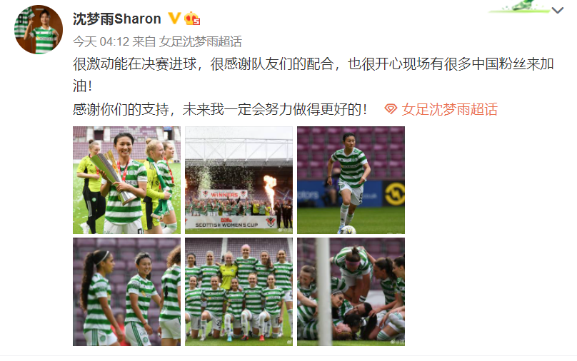 本场比赛中沈梦雨代表凯尔特人女足首发亮相。在上半场比赛进行到第18分钟时,她接到队友的转移球后小角度怒射近角得手,帮助球队率先打破僵局!这也是她本赛季第4次为球队取得进球。而在此前的苏格兰女足杯半决赛中,沈梦雨同样发挥抢眼,用一次关键助攻帮助球队晋级。最终,凯尔特人女足如愿击败对手,捧起了苏格兰女足杯冠军!