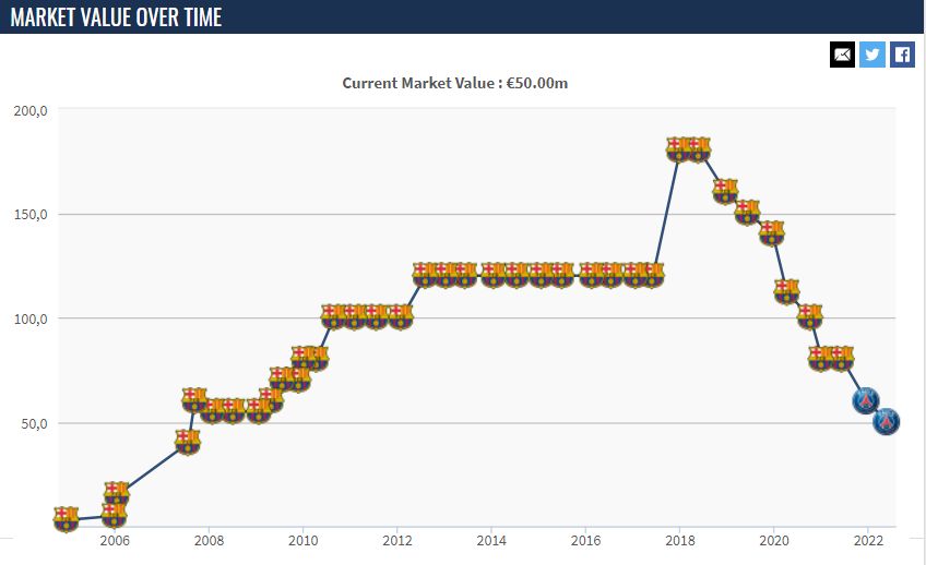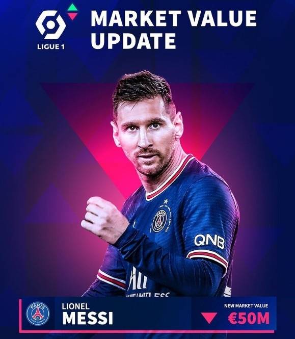 此前德转曾发布预告,梅西身价将会进行下调,今日法甲球员数据更新后,阿根廷人的身价从6000万欧元跌至5000万欧元,达到了自2007年6月以来的最低值。