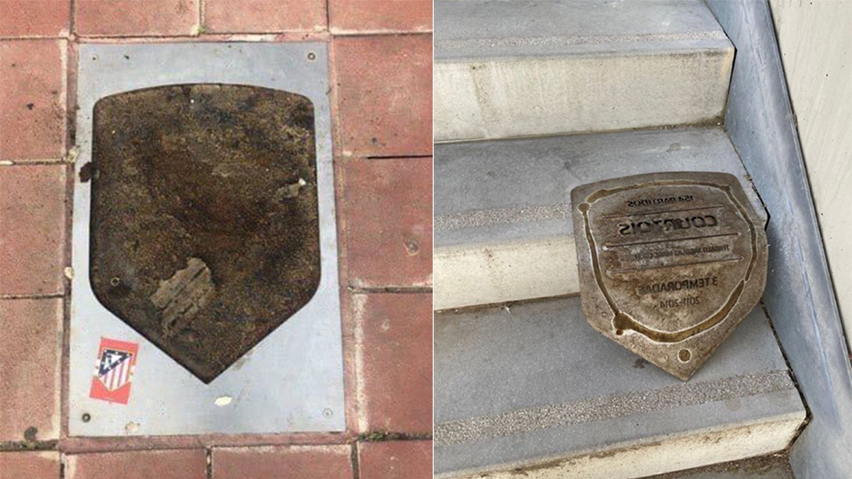 马竞球迷确实这么做了,仅仅几个小时之后的照片显示,库尔图瓦的铭牌已经被整个抠了下来,丢在旁边的台阶上。