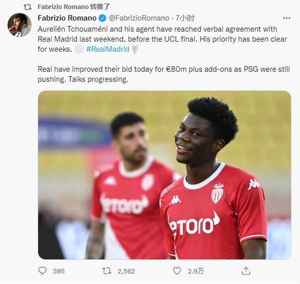 据罗马诺透露:“皇马将报价提高到8000万欧,外加额外奖金。此前巴黎也在追逐琼阿梅尼,球员的经纪人与皇马在上周达成了口头协议,球员的未来将会在几周内明朗。”