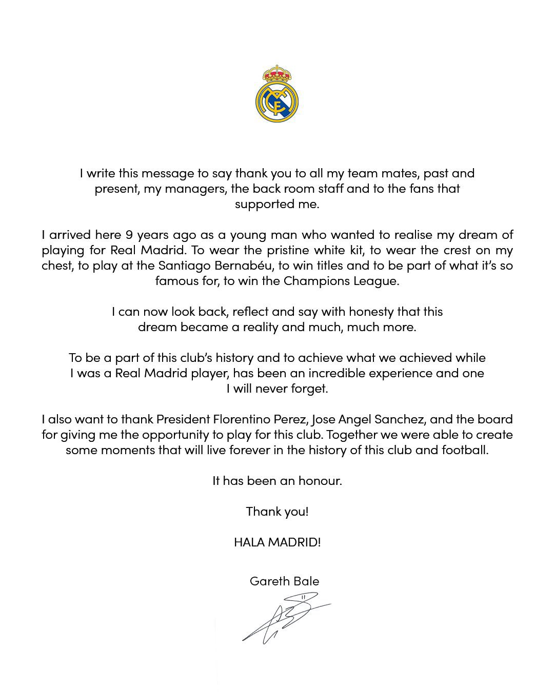 同时我也想感谢皇马主席弗洛伦蒂诺-佩雷斯、胡安-安赫尔-桑切斯以及其他给我这个机会效力皇马的俱乐部高层。我们一起创造了许多足以载入皇马俱乐部乃至整个国际足球史册的时光。