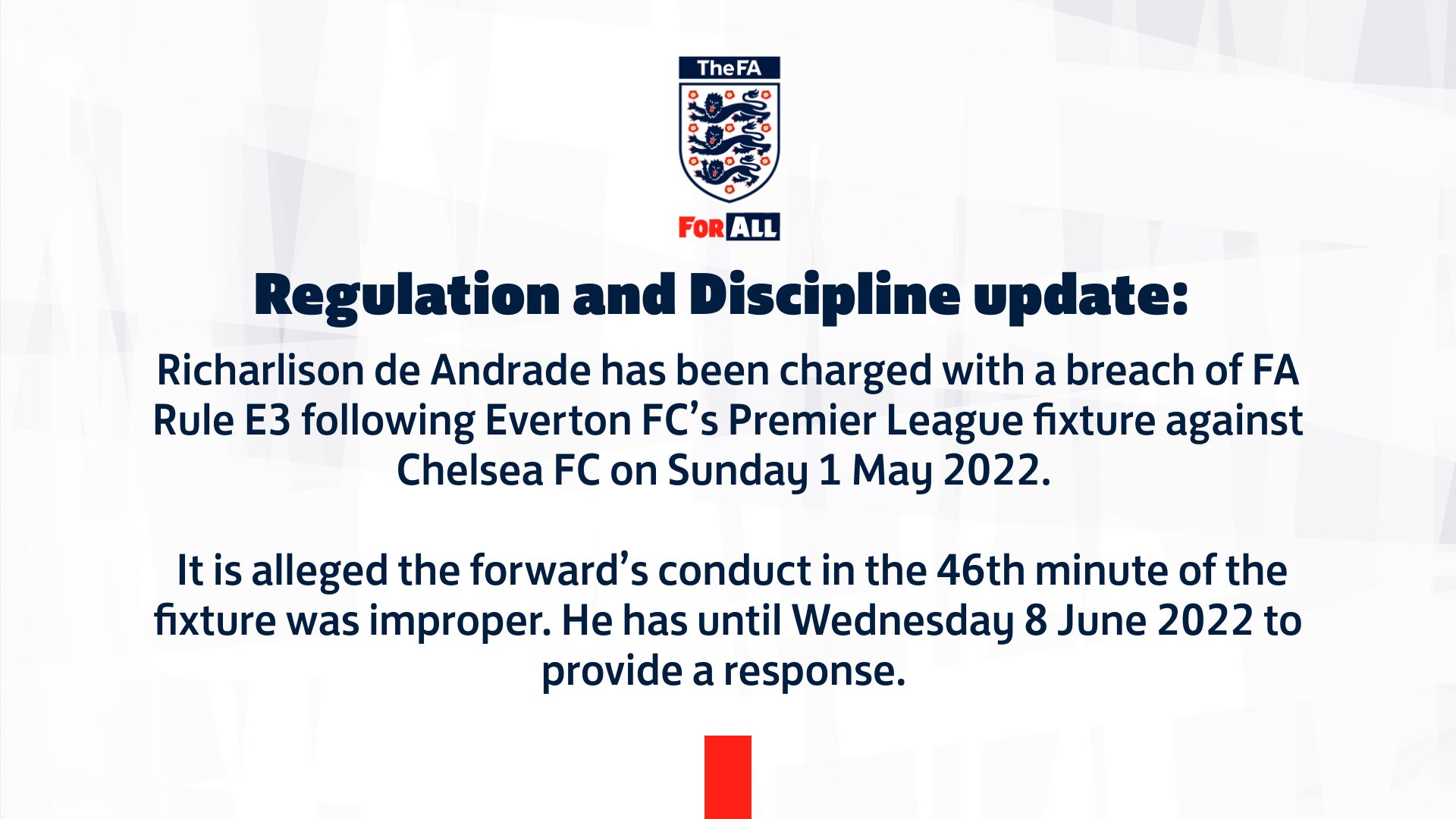 据悉,英足总指控理查利森的原因是他违反了英足总的E3条例。在对于这一事件的官方声明中,英足总表示理查利森必须要在2022年6月8日星期三之前对这一指控进行回应。