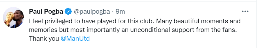 在自己的推特上,博格巴发布了一个时长为1分钟的视频,内容为自己自青年队时期以来为曼联效力的精彩镜头混剪。同时博格巴还配文表示:“为这家俱乐部(曼联)效力过让我感到十分荣幸!我在曼联经历了很多美妙的瞬间,收获了很多美好的回忆。但对我来说最重要的是球迷们无条件的支持。谢谢你们!”