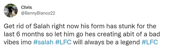 其中一位球迷表示:“现在是时候摆脱萨拉赫了!他的状态在过去 6 个月里一直很糟糕,所以让他走吧,他正在创造一些糟糕的氛围。”
