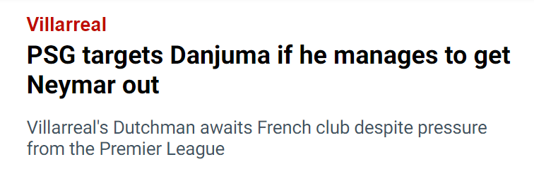 北京时间6月2日,根据西班牙媒体《马卡报》的消息,巴黎圣日耳曼有可能在夏窗签下比利亚雷亚尔攻击手丹朱马,他被俱乐部视作内马尔潜在的接班人。