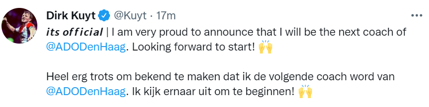 对于这一次执教机会库伊特也显得非常兴奋。现年41岁的荷兰人在自己的社交媒体上表示:“我非常荣幸地宣布,自己将成为海牙俱乐部的新任主帅!我已经对接下来的工作迫不及待了!”