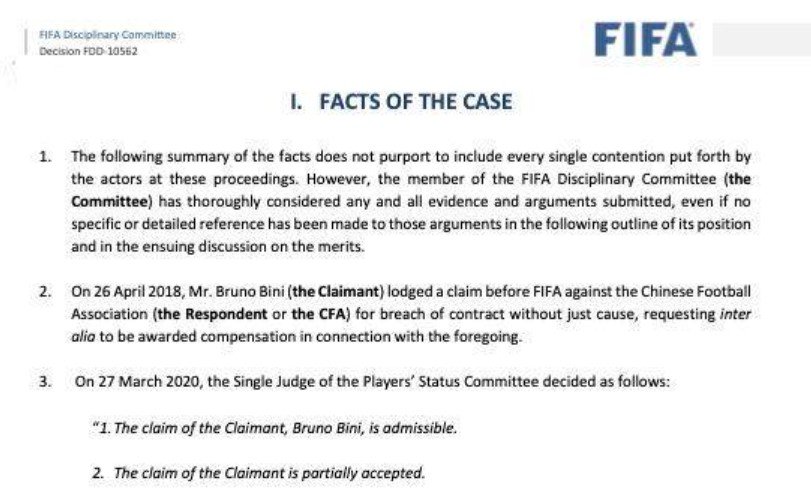 足协拖欠前女足主帅布鲁诺-比尼违约金的罚单
