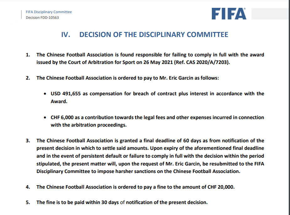 足协拖欠前女足助理教练埃里克违约金的罚单
