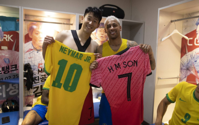本场比赛上下半时,内马尔各攻入1粒点球完成点射双响,带领巴西队5-1大胜对手。赛后,巴西国家队官方晒出了内马尔和孙兴慜在更衣室内的合影,两名球星也交换了各自的战袍,而内马尔也在个人社媒上发布了这张合影并附文“crack”,这是葡萄牙俚语中“王牌”的意思。
