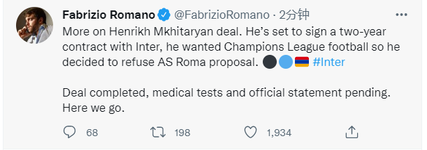 罗马诺在社交媒体写道:“姆希塔良与国米将会签订一份为期两年的合同,球员本人希望参加欧冠联赛所以他拒绝了罗马的续约。目前交易已经完成,仅剩下体检和官方宣布。Here We Go!”