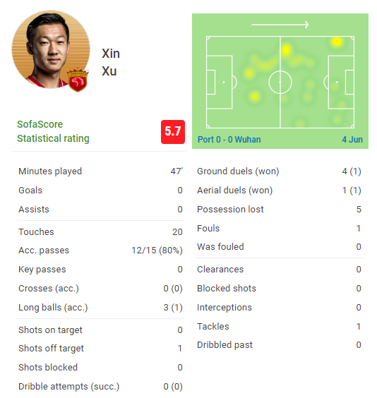 在球队中场绝对核心奥斯卡尚未回归的情况下,主教练莱科显然是将徐新视为了海港队本场比赛的场上指挥官,然而在47分钟的出场时间里,徐新只有20次触球,15次传球成功12次,3次长传只有1次成功,1次射门尝试也没能命中目标。而在防守端,徐新只贡献了1次铲球,出现了5次失位,在身体对抗方面也只取得了40%的成功率,而唯一的一次犯规就换回了一场红宝石卡。