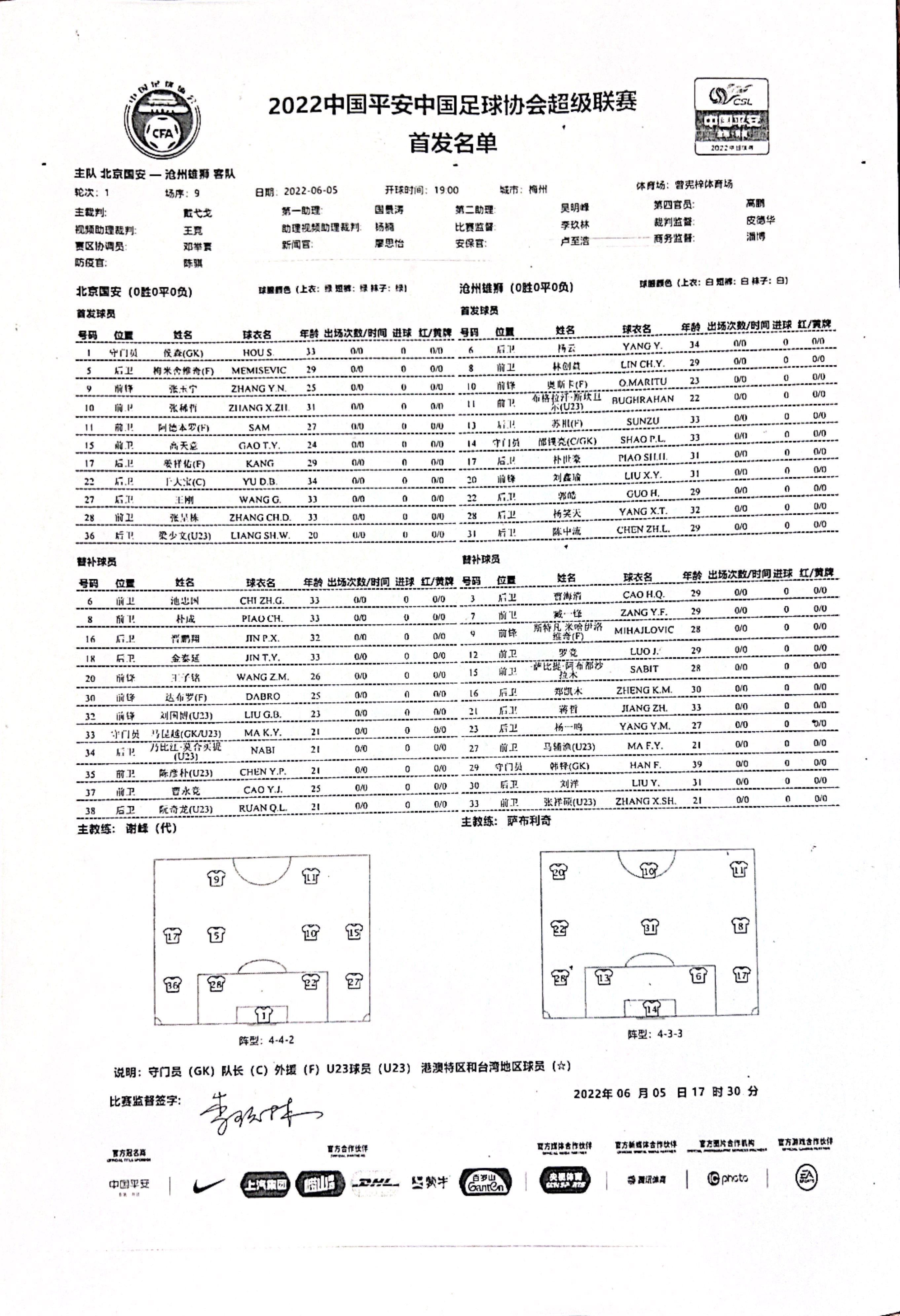 北京时间6月5日,2022赛季中超联赛首轮,北京国安对阵沧州雄狮。上半场比赛,北京国安多次造险久攻不下,沧州雄狮反击中奥斯卡助攻布格拉汗打破僵局。下半场比赛,张呈栋直红离场,奥斯卡点射扩大领先,郭皓两黄变一红被罚下场,于大宝补时扳回一城。全场比赛结束,北京国安1-2沧州雄狮遭遇开门黑。