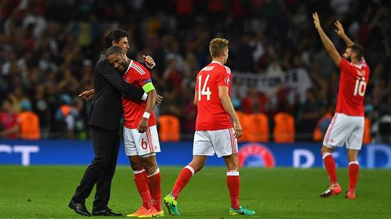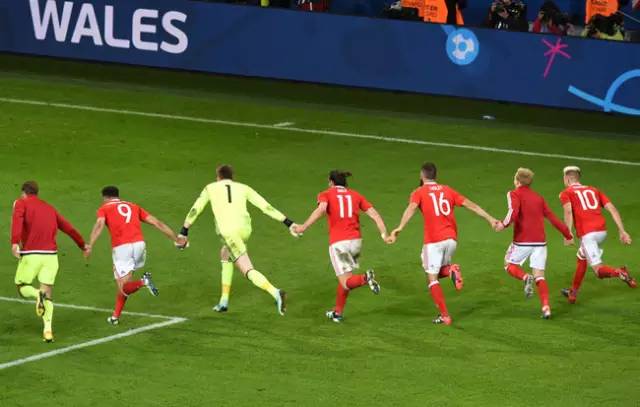 也许你还会记得,在1/4决赛终场哨响的那一刻,时任球队队长、在那场比赛中带着肩伤出战仍攻入关键头槌扳平比分的阿什利-威廉斯双手掩面喜极而泣,兴奋之情溢于言表;与主帅科尔曼拥抱时,这个傲骨铮铮的铁血硬汉如同一个孩子般靠在他的肩头,脸上挂着泪水,却也带着微笑。在赛后的欢庆中,贝尔先是领着所有威尔士球员手拉着手一起跑向了球迷所在的看台,来了一次激情四溢的集体飞翔滑草庆祝,随后又列队围成了一圈心形,来展现属于他们的美好与浪漫。