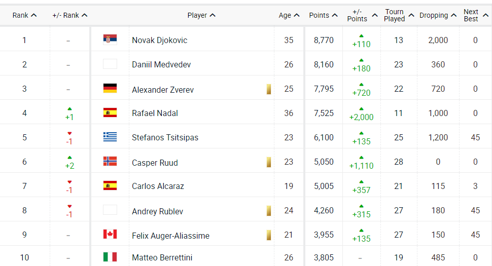 前十选手中,挪威人鲁德在法网首次打进大满贯决赛,收获亚军的同时成功超越卢布列夫和阿尔卡拉斯,排名来到世界第六;丹麦小将鲁内在法网取得生涯突破,首度打进大满贯八强,他的世界排名也提升12位,来到生涯最高的第28位;克罗地亚老将西里奇凭借闯入法网四强的成绩,本周上升6位重返TOP20,来到世界第17位。