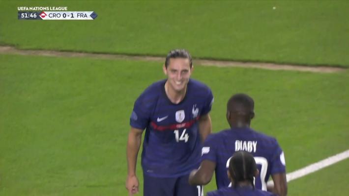 52' 本耶德尔背身护住球权,拉比奥机敏反跑前插,本耶德尔心领神会送出挑传,拉比奥接球后直面门将选择直接起脚打门,皮球直钻近角,法国队客场破僵,1-0领先克罗地亚!