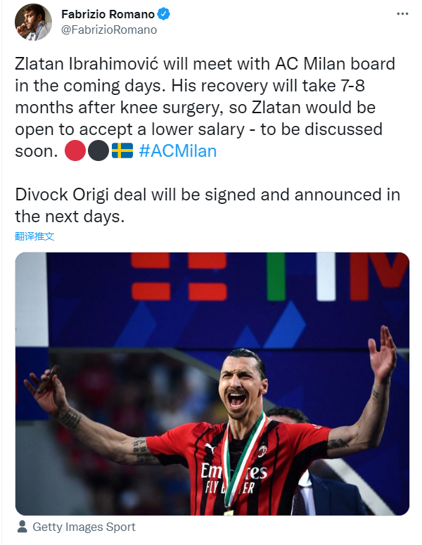 据罗马诺报道称:“伊布将在未来几天同米兰董事会会面。由于膝盖手术导致他将伤缺7到8个月,因此伊布愿意接受较低的薪水,双方将很快展开对话。”伊布拉希莫维奇今年40岁,本赛季他为红黑军团联赛出战23次,打入8球贡献2次助攻。