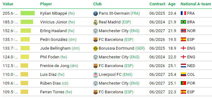 刚刚与巴黎完成续约的姆巴佩以2.056亿欧元的价格领跑,其次是1.853亿的皇马妖锋维尼修斯,刚刚加盟曼城的挪威魔人哈兰德以1.526亿名列第三。