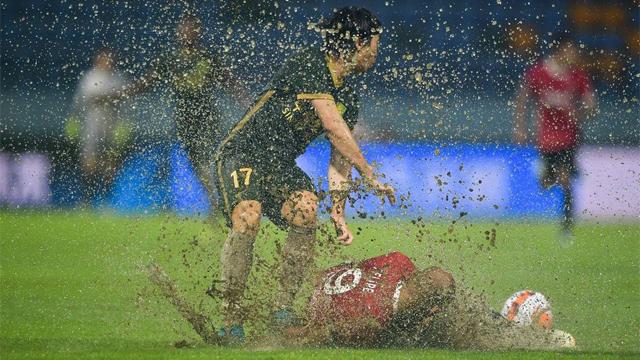 比赛开始后,球场内积水严重,两队球员几乎无法带球,每踏出一步,都必溅起水花一片。