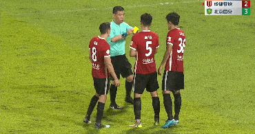 在成都蓉城场边教练、球员暴怒,场上球员上前询问,以及助理裁判的上前提示下,主裁判将愤怒的成都蓉城球员,还有一脸茫然的北京国安球员都叫回了场内,要求两队继续完成剩余的2分钟补时。
