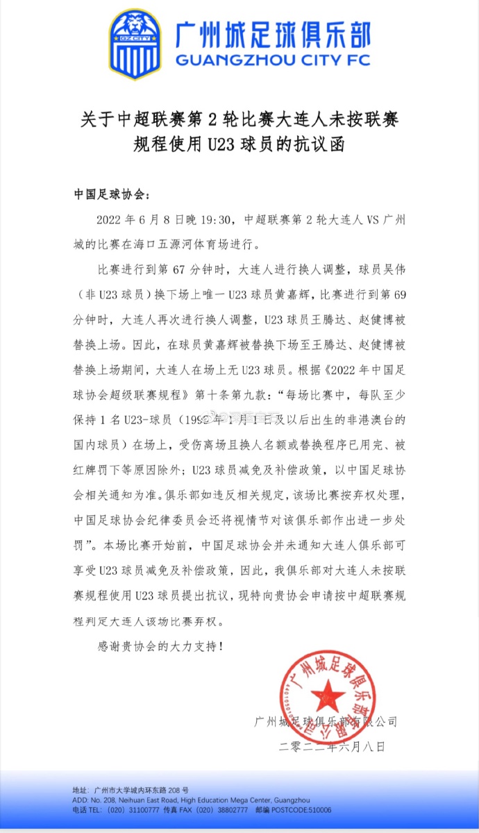 据《新快报》记者王敌透露,在比赛进行过程中,广州城足球俱乐部就已经草拟抗议函。广州城方面认为,大连人队在比赛中出现了违规换人的情况,理应认定其“弃权”。