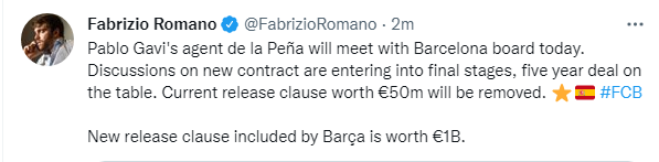 罗马诺写道:“加维的经纪人将于今日同巴萨高层会面!双方就新合同的谈判已经进行到了最后一步,巴萨提供了一份5年的合同,而双方新合同中的违约金也将会由原来的5000万欧元提升至10亿欧元。”