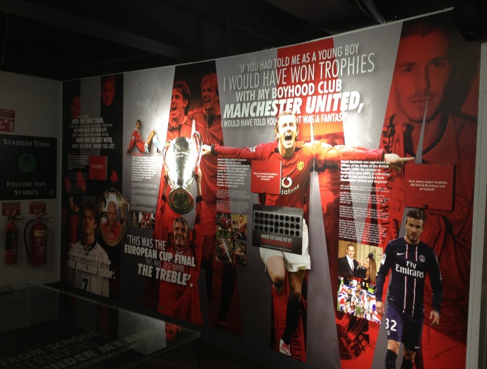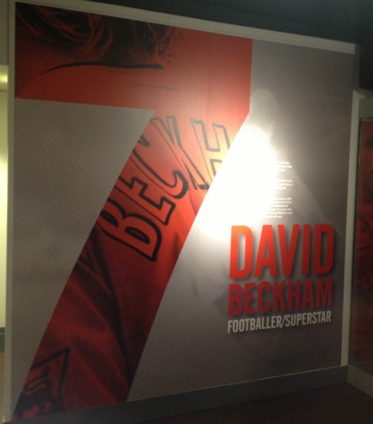 进入博物馆,首先映入眼帘的是曼联历史上最有名的7号,贝克汉姆的个人展厅。今年5月,在曼联效力了10年,又整整离开曼联10年了的贝克汉姆宣布退役,俱乐部专门为他在博物馆门口布置了一个展厅,展品包括他在曼联时期,和离开曼联后的效力的4支球队的球衣和球鞋。当然更多的还是他专门属于曼联的那段记忆。