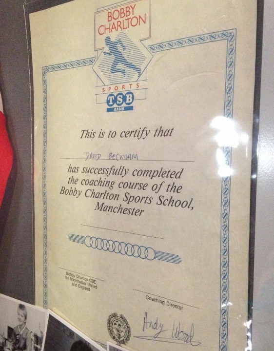 最特别的莫过于那张他毕业于博比查尔顿爵士足球学校的“毕业证”。正是从那个时候开始,贝克汉姆与曼联结下了不解之缘。不过这已经是20多年前的事情了。笔者本人也是因为贝克汉姆而喜欢上曼联,很遗憾他早已离开,不过依然能在曾经属于他的球场看到贝克汉姆的影子,也让我很欣慰。