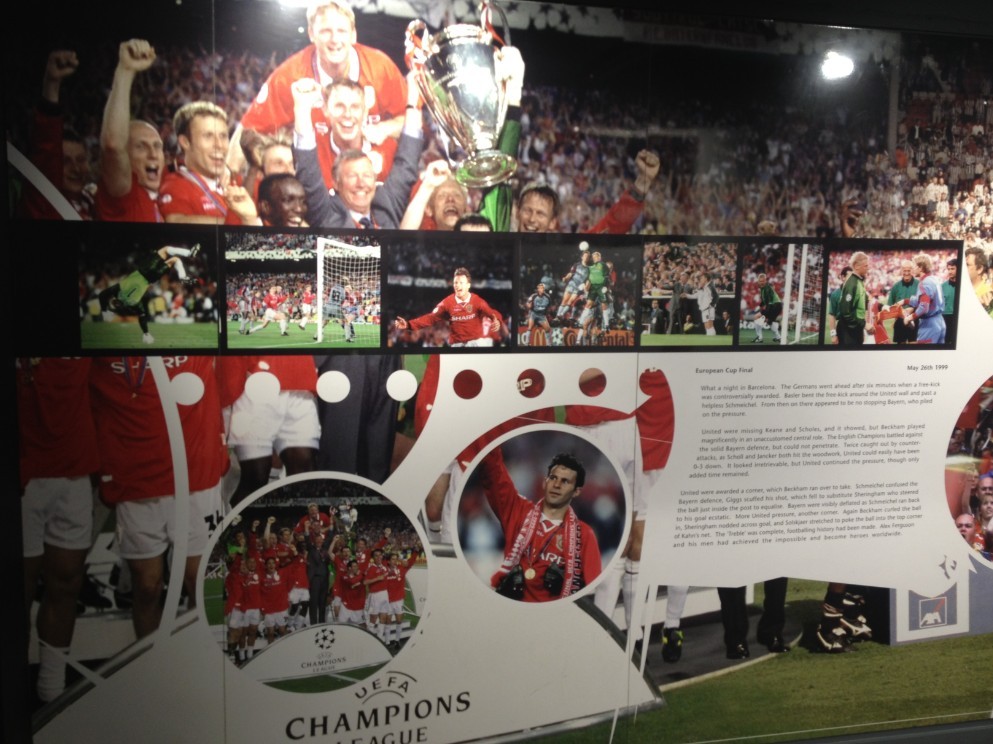 不过对于所有曼联球迷来说,1999年5月26号在诺坎普的那个晚上也许永生难忘,三冠王的赛季是曼联最好的时光。而如今在曼联博物馆,球迷依然重温当年那神奇的3分钟。展品从出场名单,到球衣,到后来的奖杯,无时无刻不提醒这你14年前发生在巴塞罗那傍晚的奇迹。电视机里无限次重复那3分钟的故事,仿佛又把你带回那个梦幻般的夜晚。
