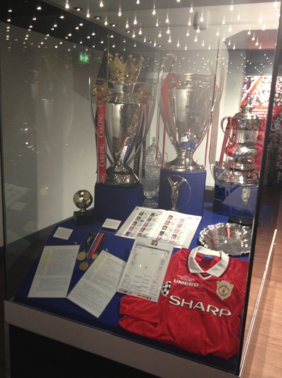 穿过门厅,我们便来到整个曼联博物馆最大的一个展厅——奖杯室。这里几乎陈列了曼联历史上所有获得过的奖杯的复制品。20座顶级联赛冠军,11次足总杯,3次欧洲冠军杯冠军。曼联几乎已经是英国历史上最成功的的球队。